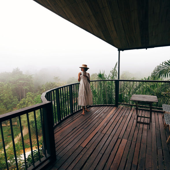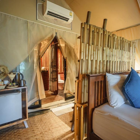 The Exotic Top View Room No. 4 and No. 5 at Khaosok Boutique Camps offer a legendary glamping experience with their double-room configuration, sharing a spacious balcony with a divider for privacy. Situated at a high vantage point, these rooms provide stunning views of the surrounding landscape and the cool, refreshing mist of the morning right from the front of your tent. This unique setup allows guests to enjoy both the privacy of their own space and the convenience of shared outdoor areas, making it an ideal choice for families or groups of friends seeking a memorable stay amidst the breathtaking beauty of Khao Sok.