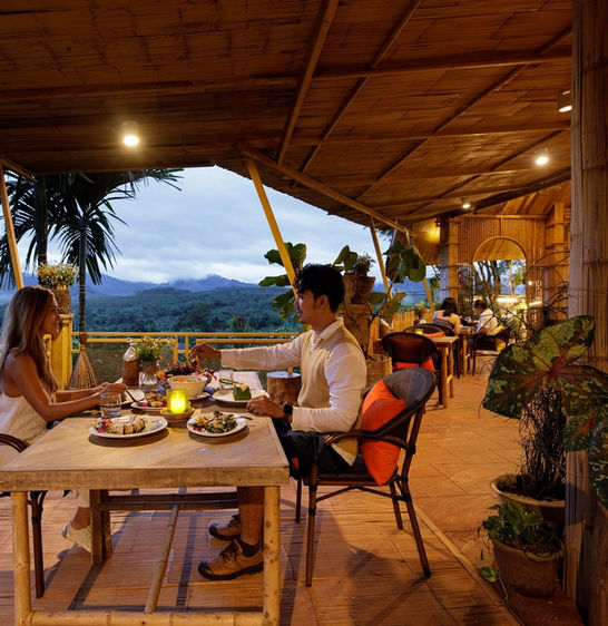 The Oxygen Restaurant at Khaasok Boutique Camps offers an enchanting dining experience, enveloped by the natural beauty of towering mountains and lush greenery.